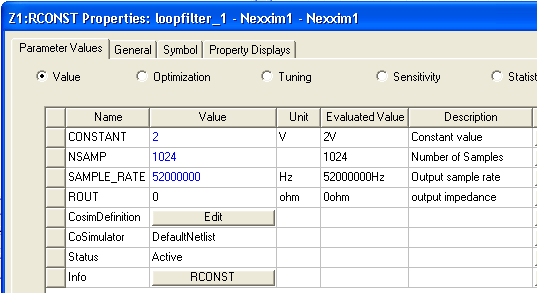 The circuit contains a source (RCONST) and a delay element (Z-D) from the System simulator component library and discrete resistors and capacitors from the Nexxim component library. The output probe (SP) is also from the System library. 1. Left-click on the RCONST element to display its property settings: