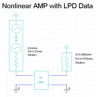 NLAMP is a four terminal device. In this example, two terminals (one input and one output) are connected to ports while the remaining terminals are grounded. The value of the characteristic source impedance specified in the loadpull data file (3.07) is added as the impedance of port 1 (input port). A load impedance of (4.5758 + j0.0985) is specified as the impedance of port 2 (output port). 4. Left-click on the NLAMP element to display its property settings: