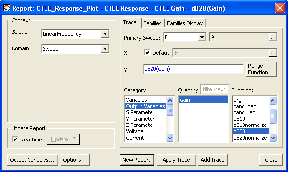 r1=50 r2=50 Notes1. Set up and run a linear network analysis (LNA) for the frequency range of interest. 2. Create a standard rectangular report from the LNA Solution, Sweep domain, using Output Variables as the Category, Gain as the Quantity,dB20 as the Function, and All Frequencies as the Primary Sweep. The setup should look like the following: