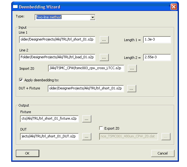 The required input is: 1. Two Touchstone files (*.s2p), each of a thru-line of a given length plus the probe fixtures. The lines must be of different lengths. 2. The imported Zo uses Touchstone file (*.s2p) of an ideal line with no fixture effects. This Touchstone file may come from measurement or simulation. 3. The imported Zo uses Touchstone file (*.s2p) of an ideal line with no fixture effects. This Touchstone file may come from measurement or simulation. If no file is specified, the wizard will approximate the Zo. 4. A Touchstone file (*.s2p) of the desired device under test with fixture effects.
