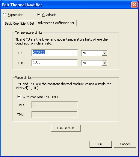 HFSS and Planar EM Simulators > Specify Thermal Quadratic ParametersTo specify Thermal quadratic parameters for a material, you must enable the View/Edit Modifier checkbox for the Thermal Modifier checkbox in the View/Edit materials dialog. Selecting Edit rather than None in the Thermal column causes the Specify Thermal Quadratic Parameters dialog to appear. ![]() In the Basic Coefficient tab, you can edit fields for the TempRef and units, and fields for C1 and C2 for the following equation: P(Temp) = Pref[1+ C1(Temp - TempRef) + C2(Temp - TempRef)^2] where the Pref is defined as the reference relative permittivity. ![]() In the Advanced Coefficient Set tab, you can edit fields for lower and upper temperature limits (TL and TU respectively) and select their units from the drop down. You can also edit the constant value limit for the thermal modifier values outside the limits. By default, these are automatically calculated. Uncheck the Auto Calculate TML and TMU to specify new values for thermal modifier lower (TML) and thermal modifier upper (TMU). Click OK to accept the edits and return to the View/Edit materials dialog.