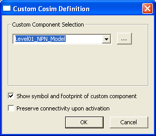 Click the pulldown menu to alter the choice of Custom Component Selection, or browse for the selection (...) If desired, check Show symbol and footprint of custom component If desired, check Preserve connectivity upon activation