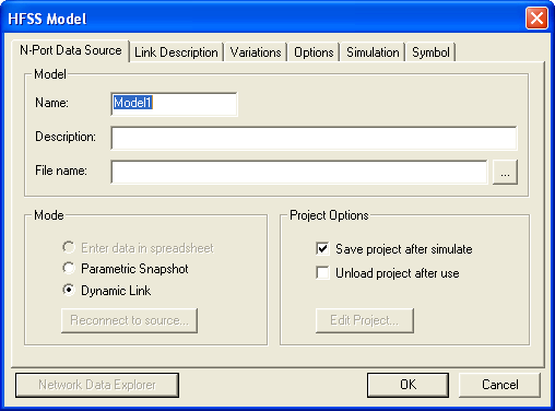 To generate a transmission line based on an HFSS port solution, first add an HFSS design to a circuit or Nexxim schematic, then on the Project menu, point to Add Model, and then click Add HFSS Model. The HFSS Dynamic Link dialog opens.