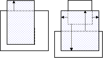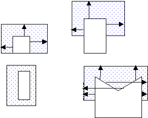 An edge is considered to overhang another edge if the two geometries intersect but neither contains the other and the first edge is inside facing and the other edge is outside facing. Arrows in the following diagrams indicate edge pairs where an edge of the geometry with dots overhangs an edge of the white geometry.