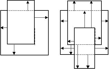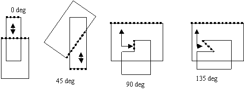 The arrows in the following figures indicate the edge pairs that are checked when considering the facing requirement and using default orientation and intersecting qualifiers: Acute Also, Not Obtuse, Parallel Also, Not Perpendicular, and Not Intersecting: