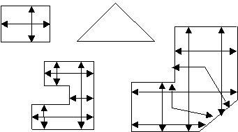 The arrows in the figures below indicate the edge pairs that are checked when using default orientation and adjacent qualifiers: Acute Also, Not Obtuse, Parallel Also, Not Perpendicular, and Not Adjacent.