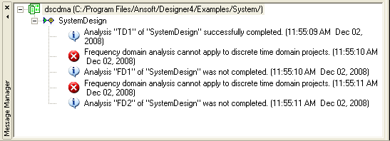 Messages in the Message Manager window are organized first by project, then by circuit. Because a design can contain multiple circuits and subcircuits, sometimes with multiple analyses for each, this organization helps you to quickly determine where errors have occurred. The following icons appear next to a message to indicate information, warnings, errors, or actions: