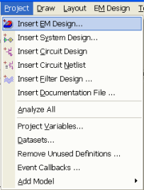The Designer Desktop > The Project Pulldown MenuTo create (insert) a new design, you must first open a new project folder by selecting New from the File pulldown. With the empty project folder selected, click the icon corresponding to the type of design you wish to create.The Project pulldown menu contains the following operations: