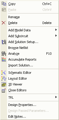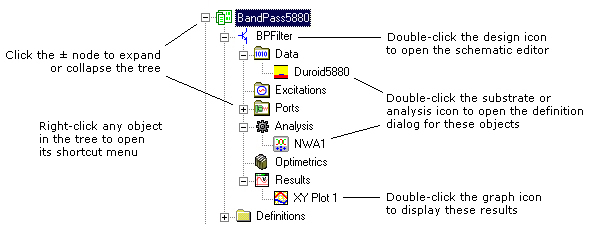 Project Manager Tree Organization Information contained in the design is organized into folders in the Project manager tree: Data—Substrate data, library references, netlist fragments, and so on Excitations—Sources in the circuit Ports—Ports in the circuit Analysis—Setup information to perform various analyses Optimetrics—Setup information to perform optimization, statistical analysis, and so on Results—Collection of graphs and tables for the design Definitions—The collection of components, symbols, footprints, and so on, accessible from Designer Double-clicking an item in these folders typically opens a dialog used to set the properties of that item.
