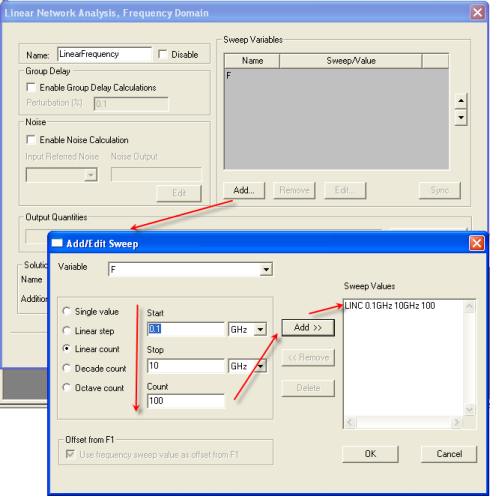 A dialog opens that allows you to add a frequency or parameter sweep if desired. For example, to add a frequency sweep using a Linear Network Analysis setup dialog shown below, click the Add button and set the frequency values. When you have finished configuring the setup, click the OK buttons to close each open dialog.