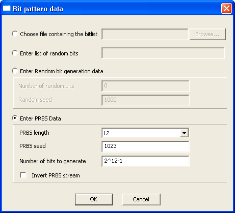 17. Select Enter PRBS Data. Select 12 as the PRBS length and 1023 as the PRBS seed. This sets up a pseudorandom bit stream for QuickEye. Click OK to close the Bit pattern data dialog. The BitPattern button shows the PRBS setup.