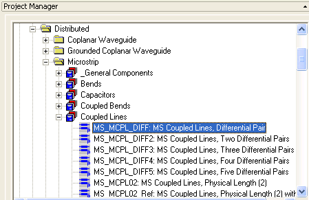 7. Click the Components tab in the Project Manager window. Expand the Distributed folder by clicking on the “+” sign. Expand the Microstrip folder, and then the Coupled Lines folder: