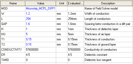 11. Set W to 2mm, L to 254mm, GAP to 1.6mm, HU to 5mm, T1 and T2 both to 0.15mm, as shown above. Leave H, CONDUCTIVITY, ER, and TAND at their default values.