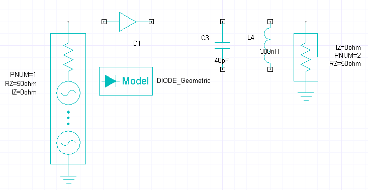 35. From the upper right corner of the designer window, click on the Ground symbol and place grounds on the lower terminals of the capacitor and the inductor. The grounds connect to the terminals automatically. 36. Click the output terminal on Port1 to start a wiring operation. A big X appears and a wire is attached to the cursor. Drag the cursor with the wire and connect Port 1 to the input of the diode. Click again to drop the wire. 37. Connect the output of the diode to the upper terminal of the capacitor. 38. Connect the upper terminal of the capacitor to the upper terminal of the inductor. 39. Connect the upper terminal of the inductor to Port 2. The schematic should look like the completed design shown at the beginning of the topic. 40. On the Designer File menu, click Save. A window opens, allowing you to specify the directory where you want to save your work, and the name for your design (the design is saved with a .adsn suffix). The next step is to set up and run Nexxim transient and harmonic balance analyses. HFSS视频教程 ADS视频教程 CST视频教程 Ansoft Designer 中文教程 |