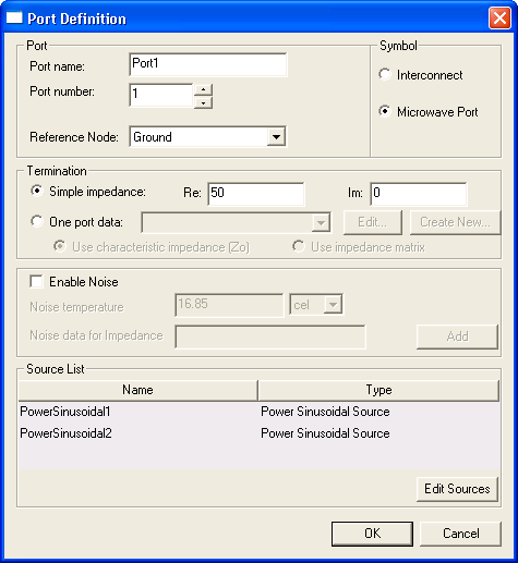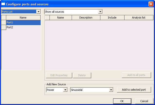 21. Select the Microwave port symbol. 22. Accept thedefault termination of 50 ohms. 23. Click the Edit Sources button. The Configure ports and sources dialog opens: