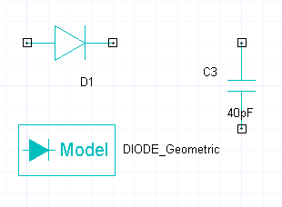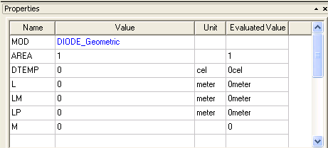 property to a unique name. We have used DIODE_Geometric. 11. Click on the DIODE_Level3_Model: element, hold down the mouse key and drag the diode model symbol into the design window. Locate the model symbol right below the diode symbol. Press Enter to drop the model symbol. 12. Click on the diode model symbol to display its properties in the Property panel. Set the ModelName property to DIODE_Geometric. Set the IS property (saturation current) to 1e-11 (amperes).