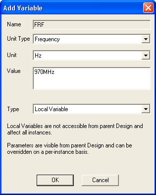 Set the Unit Type to Power, the Unit to dBm, and the Value to 20 as shown. Click OK. 26. Set the FREQ property to FLO. The Add Variable dialog opens: