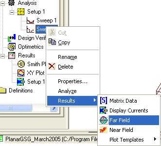 Plot the far field: 1. In the Project Manager, right-click Setup 1: Sweep2, point to Results, and then click Far Field: