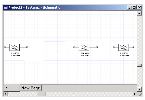 2. Select CBPF: Chebyshev Band-Pass Filter, and then right-click Place Component. 3. Now move the cursor into the Schematic Editor window, and note that the cursor changes into the filter’s schematic symbol. 4. Move the symbol near the left side of the screen, then left-click to place the component. Alternately, a component can be dragged from the component tree and placed directly on the schematic by holding and then releasing the left mouse button. 5. Place two additional Chebyshev Band-Pass filters. Left-click to place the second component and then right-click and select Place and Finish to add the third component so that your schematic now looks similar to the following: