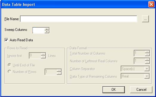 Enter the name of the tabular data file in the File Name window, or click the browse button to look for the file. When you have entered all necessary information described below into the Data Table Import dialog, click OK to import the data.