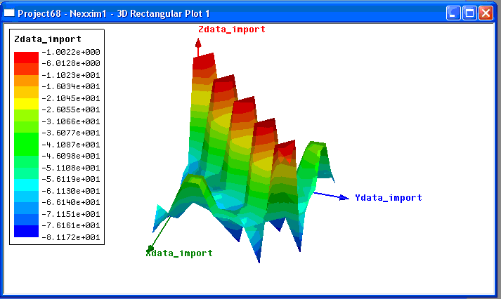 Sweep Columns This option allows you to specify the number of leftmost columns in the imported file that are to be treated as sweep data rather than quantity data. When Sweep Columns is non-zero, an implicit sweep is created automatically as the file is read. For example, with Sweep Columns set to 2, the following imported data could be used to create the 3D Rectangular Plot shown below: