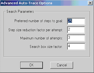 Layout Editor User Guide > Automatic Trace GenerationTo set the configuration options for Automatic Trace Generation, select Auto-Trace Style from the Layout menu. This opens the Automatic Trace Drawing Options dialog: ![]() The following options are available: Auto-select width from geometry will define the line style by bend type, cap type, and the minimum width of the geometry that is being connected. Used fixed line style will define the line style from the named line style, which explicitly gives a width as well as bend and cap types. Enable Clearance causes auto-trace to attempt to keep a minimum distance from all geometry, either as a proportion of line width or as an absolute distance. LineWidth causes auto-trace to attempt to keep a minimum distance, equal to Line Width multiplied by the <number entered>, from all geometry in the layout. Distance causes auto-trace to keep the defined distance from all geometry in the layout. Via Options specifies that the selected via type will be used when vias are placed (which occurs when the trace start and end are not on the same layer). To set additional options, select the Advanced Settings button. This opens the Advanced Auto-Trace Options dialog: ![]() The following options are available: Preferred number of steps to goal is divided into the distance from start to end in order to calculate the step size for the trace grid. In general, smaller step sizes (that is, larger numbers of steps) mean slower performance but better solutions, due to the finer control of the trace path. Note, however, that the step size can never be less than the line width of the generated path. Step size reduction factor per attempt is divided into the step size, if a path avoiding obstacles is not found. Then the algorithm is attempted again. Attempts will continue until the step size is less than the line width or until Maximum number of steps is reached. Maximum number of attempts specifies the upper limit of retry attempts for the trace. Search box size factor is multiplied by the distance from the start to end in order to set the maximum search box size for the trace. As a result, the auto-generated path stays inside the dimensions of the calculated search box. After configuring options for Automatic routing, begin the trace by selecting two pins, edges, or end points and clicking Traces > Automatic routing from the Draw menu. Outputs from the trace are generated and include lines and vias that connect input while avoiding obstacles. Note that vias are added when start/end points do not lie on the same layer, and via positions are chosen so they do not intersect metal. As a result, vias will lie over geometry on ground layers (which are negatives).