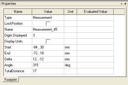 Layout Editor User Guide > Measurement ModeThe Layout editor Measurement Mode allows you to left-click on any two grid-points in order to define a segment and display the linear distance between its endpoints. Measurements are displayed as property displays on the layout. ![]() Measurements and their properties are also displayed as values in the Properties window. ![]() Type describes the value type, which is Measurement LockPosition controls the Position Locking of the measurement in the layout. The default is position unlocked. Name describes the name value, which is Measurement_45 Digits Displayed controls the number of significant digits that are displayed, and is controlled by the Measurement Distance Displays area of the Object tab of the Layout Options dialog. The default is 3 significant digits. Display Units controls whether measurement distances are displayed with the Project's current units, as defined by the Default Units tab of the General Options dialog for the Project. The default is units undisplayed. Start, End, Delta, and Angle are editable number properties related to position which will change the measurement as it exists in the layout. TotalDistance is a readonly text property that matches what is displayed on the layout.