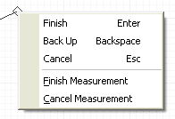 Summary To turn Measurement Mode on, select Layout > Measure To finish a measurement, select Right-Click > Finish Measurement, which ends the particular measurement, but not measurement mode. You can also finish a measurement without terminating the mode by double-clicking a location. To end a measurement and also terminate measurement mode, select Right-Click > Finish. To clear the measurement lines from the layout, select Layout > Erase Measurements. To terminate the measurement mode session, select Right-Click > Finish. To finish a measurement without terminating measurement mode, select Right-Click > Finish Measurement. To cancel a measurement without terminating measurement mode, select Right-Click > Cancel Measurement. Right-Click > Backup will backup to the last measurement segment. Right-Click > Cancel will terminate the measurement mode