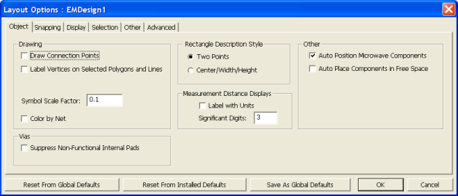 The following buttons control changes made to the local layout options: Reset From Global Defaults is used to change the settings of all the tabs to those of the current Global settings. The reset affects only the dialog contents. Reset From Installed Defaults is used to change the settings of all the tabs to those of the initial-install defaults. The reset affects only the dialog contents. Save As Global Defaults saves the currents settings under all tabs to the Global defaults registry. This action is not undoable and is not scriptable. The save takes place immediately and does not close the dialog. Use of the Cancel button after Save As Global Defaults does not restore the registry. OK saves the settings of all the tabs to the current layout to be used locally, and then closes the dialog. The action is undoable and is scriptable. Cancel closes the dialog without affecting the local settings of the layout. Both the global and local Layout Options dialogs have six tabs. The options on each tab are much the same for both global and local settings. The differences are: Save as Global Defaults is present only for each of the local options tabs. Always Show Layer Merging Dialog on the Other tab is present only for global options. Fit to Contents on the Display tab is present only for local options.