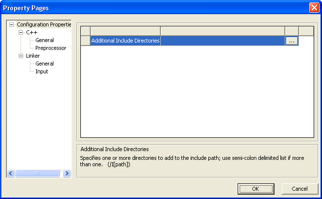 Click the directories listed in the window at left to choose from the following: Include directories Preprocessor definitions Additional library directories Additional dependencies As you click through different directories, an informational message is displayed at the bottom of the dialog. Click the browse button (...) at upper right to open a browse window for a list of additional resources from which to choose. Click OK to close the browse window. Click OK to close the Property Pages dialog.