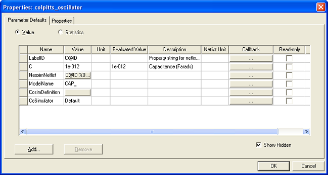 ![]() Parameter Defaults TabThis tab displays and sets the default values for component parameters for general analysis (Value option) or statistical analysis (Statistics option).