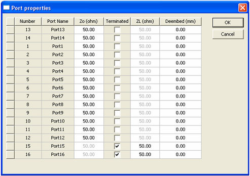 Network Data Explorer > Changing Port Properties and Reducing Matrix SizeAccess the Port Properties dialog through the Edit Port Properties option on the Edit menu. The normalization impedance, termination, port order, gamma values, and de-embedding distance may all be edited through this dialog.