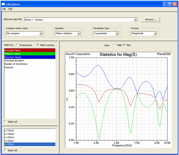 Network Data Explorer > Creating a Statistics Plot1. Select Matrix statistics in the Quantity control field. 2. Select Matrix entries in the data selection pane at left. 3. Select Plot in the data view pane at right. 4. Choose the statistics and variations to display.