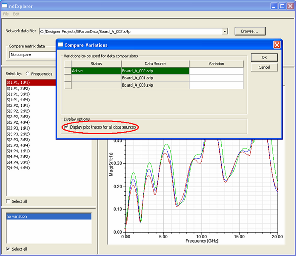 Network Data Explorer > Displaying Plot Traces from Multiple Data Sources1. Open multiple data sets, either through the main file browser or through the data comparison browser. 2. Use the Edit menu or the right-click menu to open the Select Compare Variations dialog. 3. Enable the Display plot traces for all data sources option.