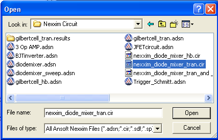 Netlist Editor User Guide > Loading a Nexxim Netlist from a FileTo load a design from an existing Nexxim Circuit netlist file, use the File > Open command. Select the “All Ansoft Nexxim Files” extension in the Files of type window of the Open dialog.