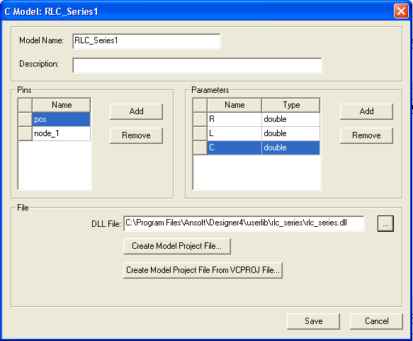 The Model Name appears as you entered in the previous dialog. Use the Pins and Parameters fields to enter the names of the pins and parameters as they appear in the DLL. Enter the name and path to the DLL file. If desired, use the browse button (...) to locate the DLL file from a File Open dialog. Click Save. The new model appears on the Edit Libraries dialog: