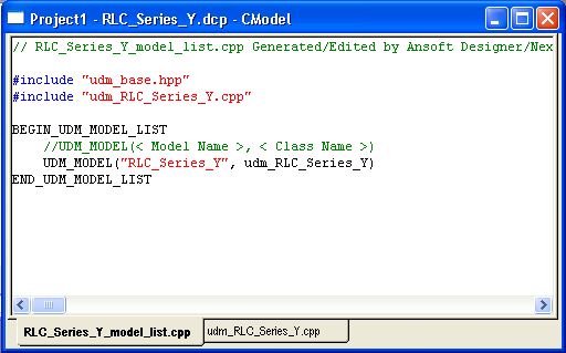 Select the Model Type (S-parameter, Y-parameter, or Analog VI, and indicate whether the template is to include code for noise analysis. Click OK. 7. The new model list file and the C Code Template appear in the design area: