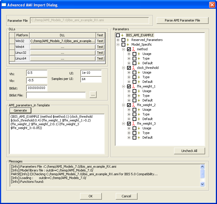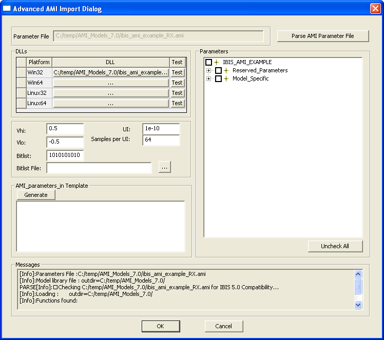 The Parameters tree is populated from the parameters file. Reserved parameters are marked R and Input parameters are marked I. Reserved and Input parameters are added as component properties when the component is created. By default, only the Model Specific parameters are checked. Use the checkboxes to select Resrerved parameters or to uncheck Model Specific parameters. Selected parameters appear in the Netlist Parameter string. Click the Generate button to create the netlist parameter string. Here is an example of the Advanced AMI Import dialog with all the steps completed:.