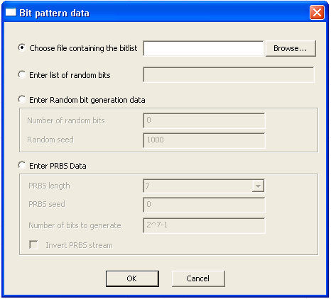 Select one of these methods for generating the AMI bit pattern. To link to a file with the bit values, click on the Choose file button, then use the Browse dialog to locate and select the data file. To specify a bitlist, click the Enter list button and type in the list of 1s and 0s. To generate a random sequence of bits (instead of the bitlist or bitfile), click the Enter random button. Enter the number of bits and the seed value. To generate a pseudorandom sequence of bit patterns of various lengths, click the Enter PRBS Data button. Use the pulldown to select the length of the pattern, PRBS_length, (2 to 31 bits). Enter a PRBS seed value, and specify the total number of bits to be generated. To invert the PRBS bit stream, check the checkbox at the lower left of the PRBS Data panel. Click OK to close the Bit pattern dialog and return to the AMI Source parameter list.. To specify one or more repeats of the bits in the bitlist, bitfile, random sequence, or PRBS, set the repeat_count parameter on the AMI Source to the number of repeats. The do_encoding parameter controls 8b10b encoding of the transmitted bitstream. The default is no encoding (do_encoding=0). To enable 8b10b encoding, set do_encoding to 1. The Hold Last Bit checkbox is for crosstalk analysis. When an aggressor’s bit stream is shorter than the victim’s bitstream, the aggressor’s bitlist can be repeated or the last bit value can be held for the duration of the victim’s bitstream. The default is to repeat (checkbox not checked).