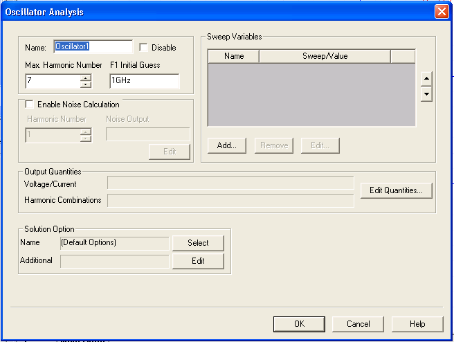 4. Type an Analysis Name (or accept the default name, for example, “Oscillator”). 5. For most simulations, leave the Disable box unselected (the default setting). Selecting this box lets you store multiple solution setups for later use. (Note that if a solution setup is disabled before the analysis is run, any changes made to the design will invalidate the simulation results.) 6. The Oscillator Analysis dialog box appears. This dialog allows you to specify the maximum harmonic number to include in the analysis, and a frequency in Hz to be used as the initial guess for the oscillator frequency: Specify the maximum harmonic number to use in the analysis by clicking the up and down arrows in the Max. Harmonic Numberfield. Specify the frequency for F1 Initial Guess. The initial guess should be the same frequency as the FREQ parameter on the oscillator probe. The F1 Initial Guess value overrides the probe FREQ parameter if they are not the same. 7. Optional: To run Phase Noise analysis, check the Enable Noise Calculation box. See Running Phase Noise Analysis from the Schematic Editor for details on the other steps in setting up the phase noise analysis. 8. To add a sweep, locate the Sweep Variable area in the Oscillator Analysis dialog box. In the Sweep Variable area, click Add, and the Add/Edit Sweep dialog box appears. In the Variable list, select Temp or the name of a variable (when a variable has been defined for the design), and then select one of the following: Single value, Linear step, Linear count, Decade count, or Octave count. Type the sweep values into the Value text box (for Single value), or into the Start, Stop, and Step text boxes (for Linear, Decade, or Octave count), and make sure that the appropriate units are selected for each. For details on sweeps, see Variable Sweep. Click Add, and then click OK to close the Add/Edit Sweep dialog box. The Oscillator Analysis dialog box reappears. 9. Click on the Edit Quantities button in the Output Quantities field to open the Defined Output Quantities dialog box. Expand the icons for the circuit components (Nets and individual devices), and use the checkboxes to select quantities for output. Expand the Harmonics icon to display a list of harmonics (the number of available harmonics is set by the Max Harmonic Number specified in Step 6). Select and Add the harmonics you want to analyze. If you do not select any harmonics, harmonics DC, F1, 2F1, 3F, and 4F1 are automatically selected. In the Report dialog, only selected harmonics are available for plotting. Click OK to return to the Oscillator Solution Setup dialog box. 10. Optionally, use the fields in the Solution Option panel to select or add Oscillator analysis options and other Nexxim options to the design. Click the Select button on the Name field to open the Select Solution Options dialog. If any options sets have been defined, their names appear in the Select Solution Options list. To select a named option set that you have previously defined, click the name of the option set, then click OK to return to the Oscillator Analysis dialog. The named option set appears in the Name field in the Solution Options panel. See Analysis-Specific Options for details on creating option sets outside of the Solution Setup dialog. To create a new option set, click New. The Solution Options dialog box appears. Select the Oscillator Options tab: