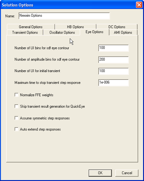 3. Type an Analysis Name (or accept the default name, for example “VerifEyeAnalysis”). 4. For most simulations, leave the Disable box unselected (the default setting). Selecting this box lets you store multiple solution setups for later use. 5. The Input panel controls the statistical eye analysis. Specify the Delay to be applied before the step response is applied (default is 0 seconds) Run missing step response allows simulation to proceed when an External Step Response component is present in the design but no step response data file can be found. 6. To add a sweep, locate the Sweep Variable area in the VerifEye Analysis dialog box. In the Sweep Variable area, click Add, and the Add/Edit Sweep dialog box appears. In the Variable list, select Temp or the name of a variable (when a variable has been defined for the design), and then select one of the following: Single value, Linear step, Linear count, Decade count, or Octave count. Type the sweep values into the Value text box (for Single value), or into the Start, Stop, and Step text boxes (for Linear, Decade, or Octave count), and make sure that the appropriate units are selected for each. For details on sweeps, see Variable Sweep. Click Add, and then click OK to close the Add/Edit Sweep dialog box. The VerifEye Analysis dialog box reappears. 7. Optionally, use the fields in the Solution Option panel to add VerifEye/QuickEye options. Click the Select button on the Name field to open the Select Solution Options dialog. Click New to create a new option set. The Solution Options dialog box appears.