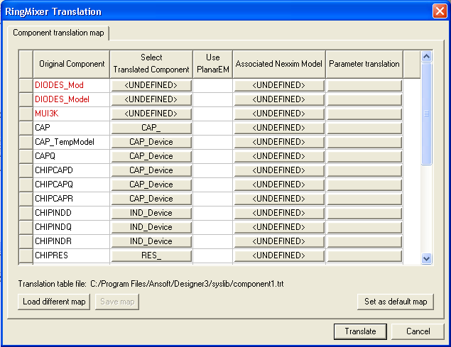 The translator uses a translation map to control the conversion from Circuit components and models to Nexxim components and models. The Translation dialog displays the default translation map, syslib/component1.trt, in black. The listing includes all mapped components, whether or not they are actually in the Circuit design being translated. Components and models that are not yet mapped are shown in red. Saving and Loading Translation Maps In addition to the default translation map, you can define your own maps. Three buttons allow you to create and select maps. When you have made changes to the map that is currently displayed, the Save map button is enabled. Click Save map to open a Select File dialog. Browse to the directory where you want to save the map, assign it a file name, and click Save. To make your map the default to use for subsequent translations, click the Set as default map button. To load a different map, click the Load different map button to open a Select File dialog. Browse to the directory containing the map, select the map file, and click Open. Specifying a Component Mapping The leftmost column of the Translation dialog lists the components in the Circuit schematic. To specify (or change) a mapping for a Circuit component in the Translation dialog, click the button in the Select Translated Component column. If the component is unmapped, the button reads “<UNDEFINED>”; otherwise, the button shows the current mapping. The Select Definition dialog opens. Click the Show all libraries checkbox: