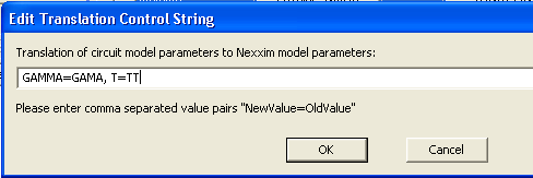 Select the desired Nexxim component and click OK to close the Select Definition dialog and return to the Translation dialog. The Translation dialog now shows the Nexxim component that will be used to translate the Circuit part. The mapped Circuit component name now appears in blue. Controlling Property Mappings Typically, a property on a Circuit component will have a corresponding property (also called a parameter) on the Nexxim component. The names of the corresponding properties may be the same on both Nexxim and Circuit components, or they may differ. By default, the translator copies the value from a Circuit component property to the corresponding parameter in the mapped Nexxim component. When the property names on the Nexxim and Circuit components are different, you must provide the parameter mapping. On the Translator dialog, click the Parameter translation button for the Circuit component (the parameter translation also applies to any associated Circuit and Nexxim models). The Edit Translation Control String dialog opens: