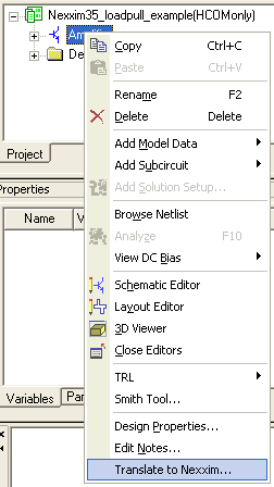 Nexxim Simulator > Translating Serenade Schematics to Nexxim SchematicsDesigner offers a mechanism for translating Circuit (Serenade) schematics directly to Nexxim schematics. Open the Designer project (adsn file) with the Circuit schematic. Right-click on the Circuit design and select Translate to nexxim from the pulldown: