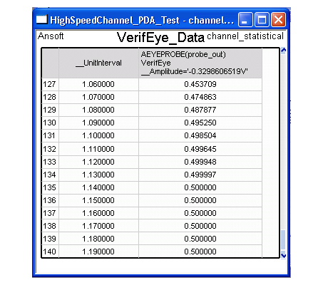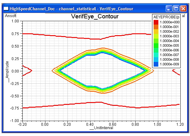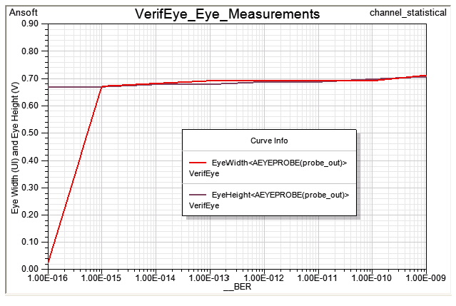 The values for AEYEPROBE are the bit error rates using logarithmic scaling. Amplitude represents the voltage transitions and UnitInterval is the location of the data relative to the unit interval. 2D Step Response Plot To display the initial step response of the channel: Under Reports, select Create Standard Report>Rectangular Plot. Use the Domain pulldown to select Initial Reponse. Click New Report. The report shows the initial response of the channel in the time domain ![]() Eye Measurements To plot the eye width and height measurements against the bit error rate: Under Reports, select Create Statistical Eye Report>Rectangular Plot. Use the Domain pulldown to select Eye Measurement. Use the CTRL key to select both Eye Width and Eye Height in the Quantities list. Click New Report. The report shows the eye width and height plotted against the bit error rate.