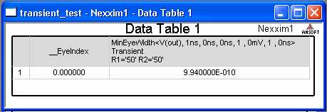 Bit Error Rate Data Table To display the Bit Error Rate (BER) information as a table, select Create Statistical Eye Report>Data Table from the Results menu. Select Eye Measurement as the Domain, Eye as the Category, Eye Width and Eye Height under Quantity, and <None> as the Function. Click New Report.