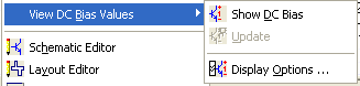 Nexxim Simulator > Viewing DC Bias Voltages and Currents in a SchematicTo run a DC bias analysis on a Circuit design from the Schematic Editor, click on Circuit and select View DC Bias Values from the pulldown menu. A submenu appears: