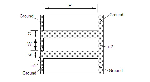 [P=val] n1 and n2 are the names of the nodes attached to the transmission line. The entry COMPONENT=cpwtrl identifies the element as a coplanar waveguide transmission line, physical length. The SUBSTRATE=substrate_name is the coplanar waveguide substrate model name selected for the design (see Selecting a Coplanar Waveguide Substrate for details).