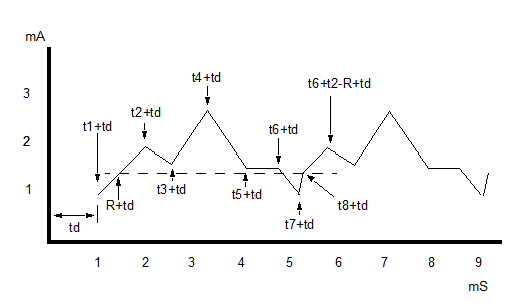 3. Here is an example using eight time points plus a time delay, with a repeat time (R) that occurs between timepoints, so that interpolation is required. I2 1 0 PL( + 1.0e-3 0.0 $ v1 t1 + 2.0e-3 1.0e-3 $ v2 t2 + 1.6e-3 2.6e-3 $ v3 t3 + 2.7e-3 3.3e-3 $ v4 t4 + 1.6e-3 4.1e-3 $ v5 t5 + 1.6e-3 4.7e-3 $ v6 t6 + 1.0e-3 5.2e-3 $ v7 t7 + 0.4e-3 5.3e-3 $ v8 t8 + ) R=0.4e-3 TD=1.0e-3 Note the use of timepoint t8 to avoid an “instantaneous” jump in output where the repeat begins. If t8 were omitted, the output would change from the level at t7 to the (interpolated) value at the start of the repeat with no time difference between the two values. Such a sudden discontinuity can cause a timestep-too-small failure in transient analysis. The diagram below illustrates this example, showing one repeat: