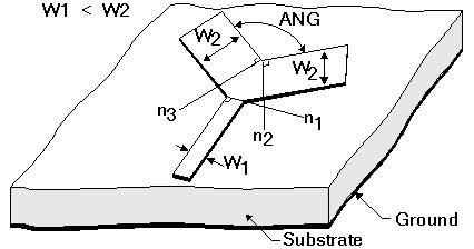 Netlist FormatAn instance of a Y-junction has the following netlist syntax: AYJUNxxx n1 n2 n3 W1=val W2=val ANG=val COMPONENT=yjunction SUBSTRATE=substrate_name n1, n2, and n3 are the names of the nodes attached to the junction. The entry COMPONENT=yjunction identifies the element. The entry SUBSTRATE=substrate_name identifies the microstrip substrate model name selected for the design (see Selecting a Microstrip Substrate). See the Microstrip (MS) Substrate for information on this substrate type.